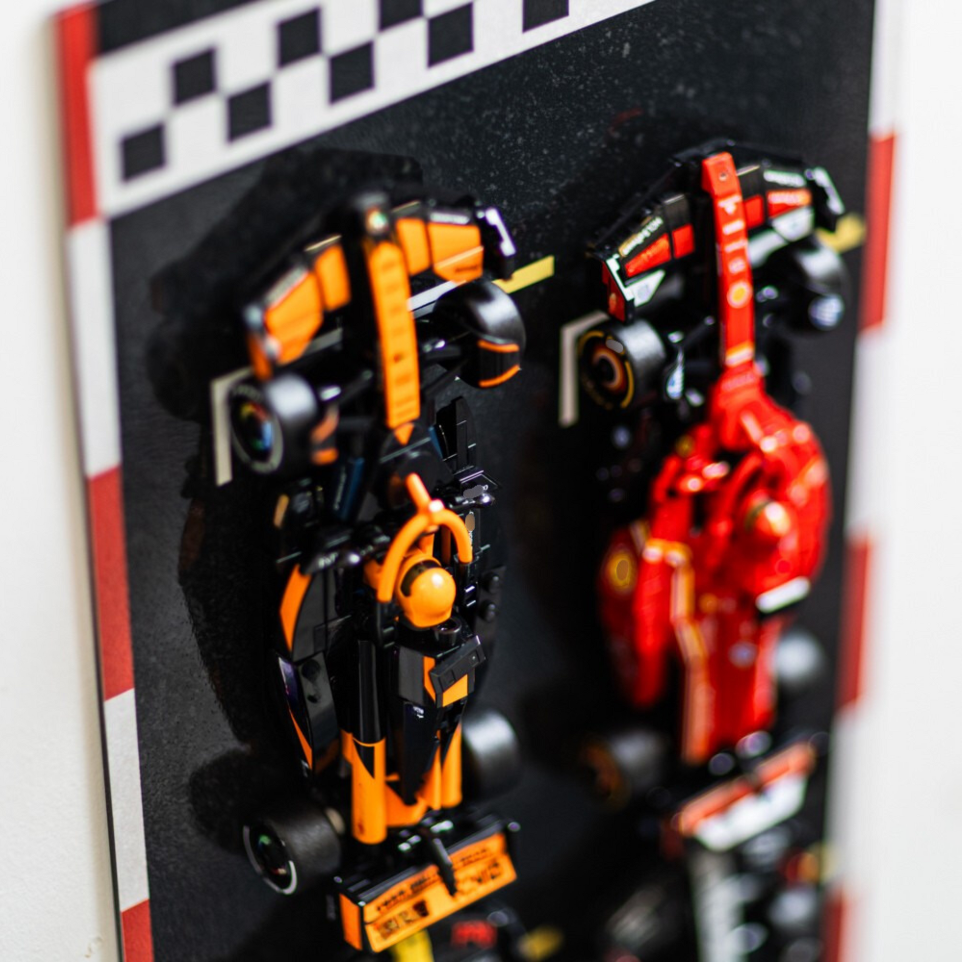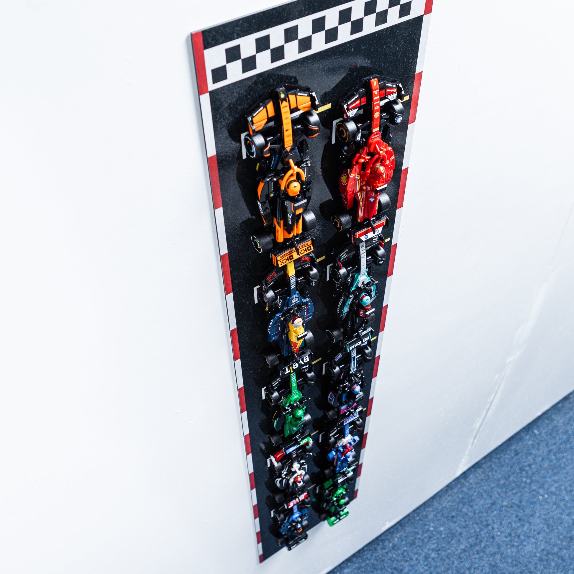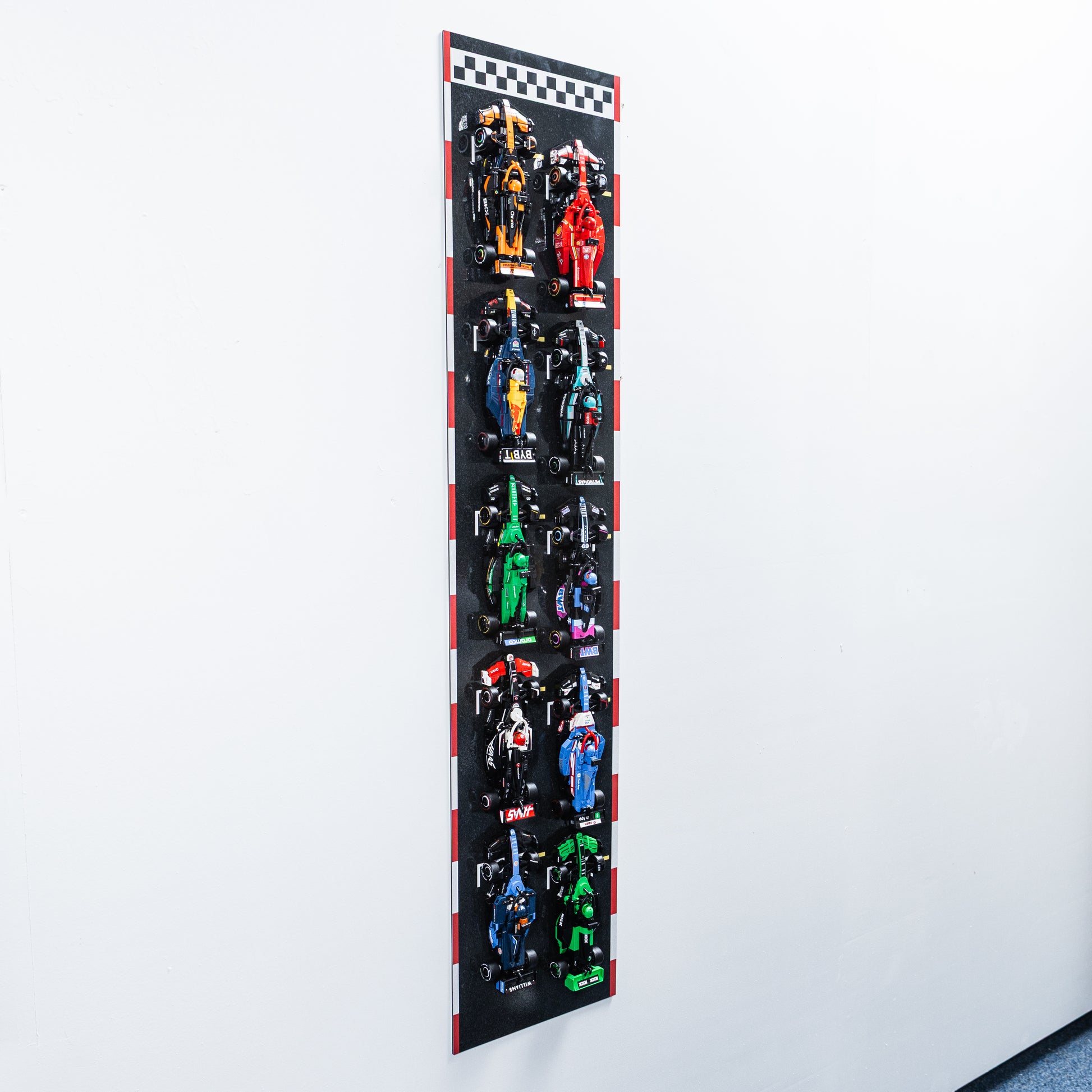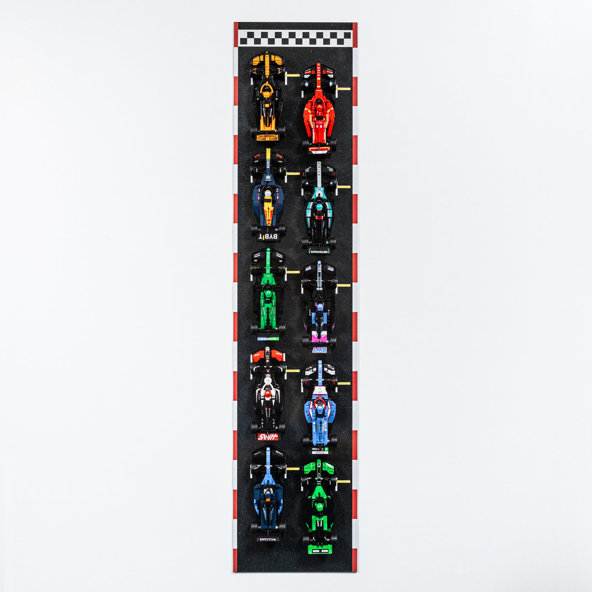- Racing-Inspired Design – High-quality detailed printing with bold, vibrant colours. Track-style background, checkered flag top and red/white curbs make your display feel like a real F1 grid.
